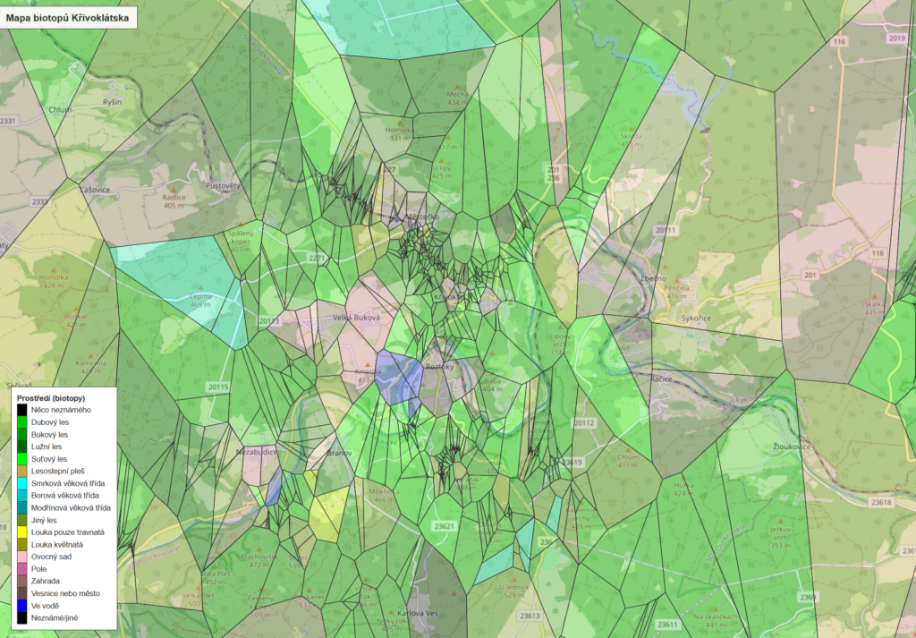 Voroného diagram procházek. Čím jsou polygony menší, tím to máme více prochozené a tedy přesnější. Čím větší, tak tam máme s dětmi ještě docela mezery.