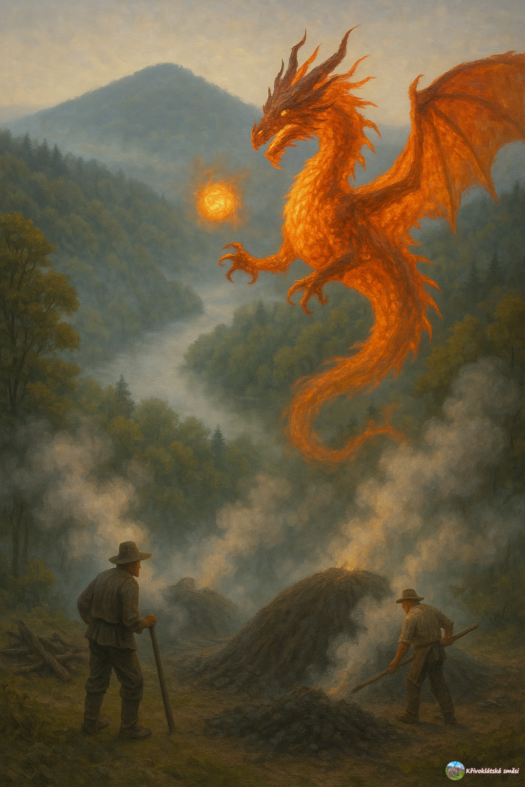 V mlze se objevila silueta. Jiskry tvořily obraz, spojily se v podobu strašlivého ohnivého draka. V ohlušujícím syčení začali rozeznávat slova. Samým strachem ztuhli. „Jsem pán kouzel,“ zazněl syčivý hlas, „jen já! Kouzlíte v milířích, žádáte si dar lesa, a mně oběti nepřinášíte. Zasloužíte trest, všichni do jednoho!“
