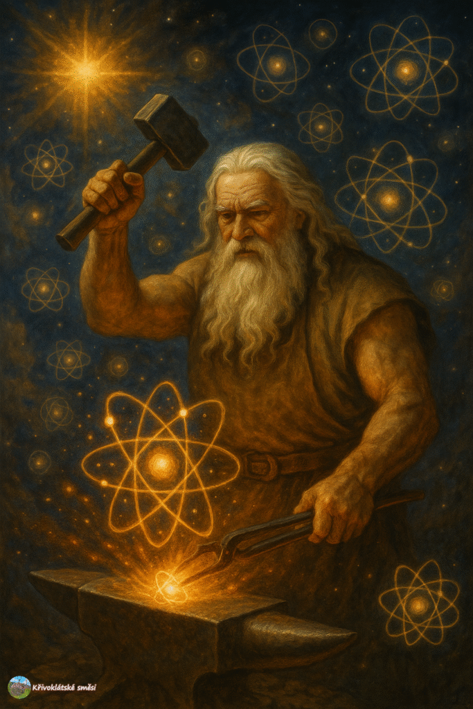 První listy představovaly koncentrovanou energii, hmotu, v podobě trojlístků, triskelů. Tak se vydělily protony tvořené z třech kvarků, které se přitažlivou silou shlukovaly do niter hvězd, kde se pod tlakem kladiva nebeského kováře začaly transmutovat v prvky. Vybuchující hvězdy tak do nitra jako chléb a medovina kynoucího vesmíru vyvrhly všechny ty prvky důležité pro život, jakými jsou vodík, uhlík, kyslík, síra a mnohé další. „Svět se skládá z atomů,“ je snad ten nejdůležitější poznatek, předávaný od dob starověkých atomistů, ale braný vážně pouze v posledních ani ne dvou staletích.