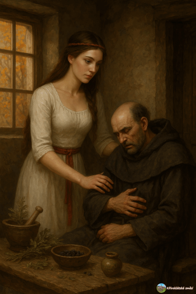 První den dala Hana mnichovi pít silný odvar z čerstvého kořene kozlíku, který hned po vykopání ze země příjemně květinově voní. Druhý den celou místnost provoněl dým divizny, pelyňku černobýlu, jalovce a mateřídoušky, byliny, které se v pozdějších dobách budou používat proti moru. Třetí den donesla Hana mnichovi odvar z kopřivy smíchaný s klinopádem, k jídlu pak uvařené bobule jeřábu muku a další léčiva ze zdejších lesů, jinde neznámá.