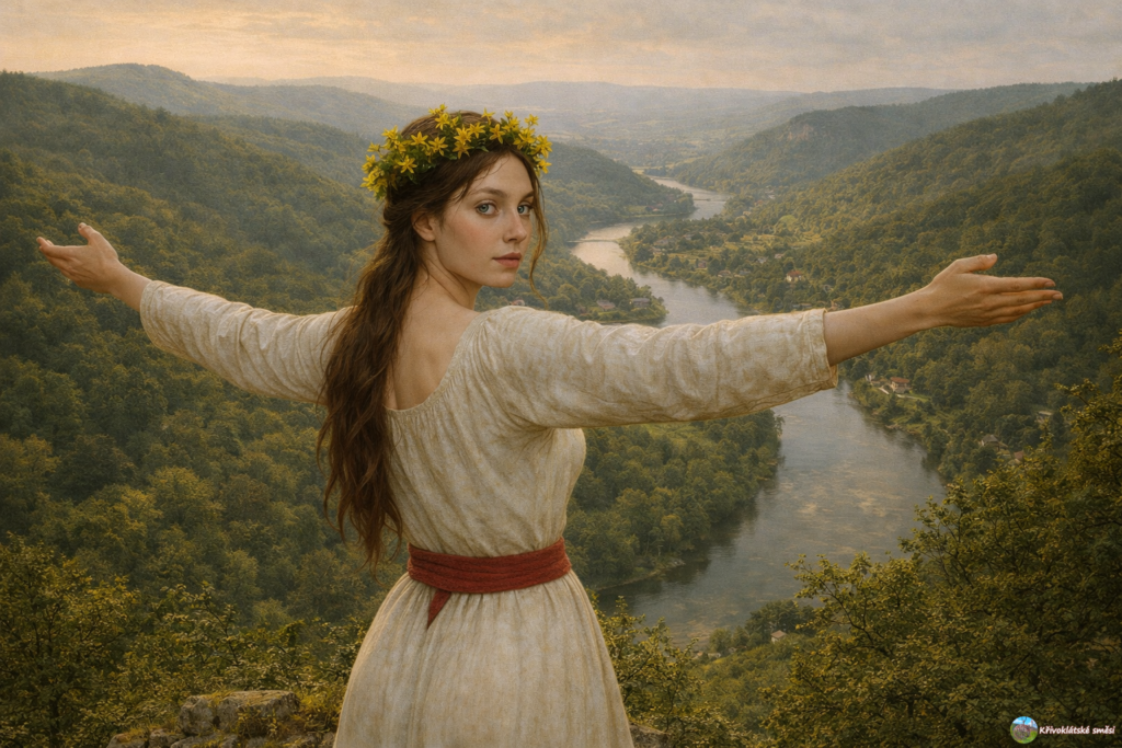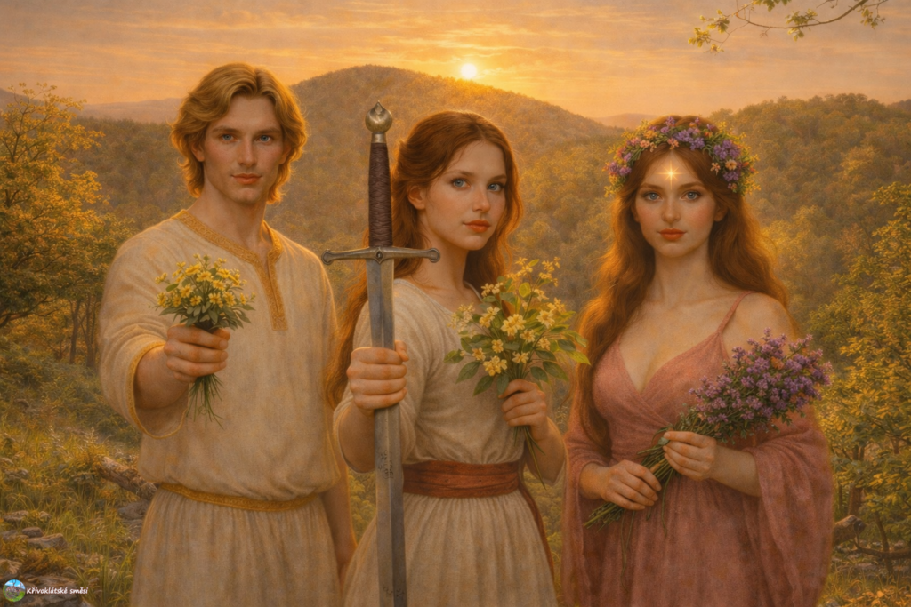 Na křivoklátské ostrožně vládl ruch. Děti pobíhaly mezi domy a rozhazovaly kolem sebe světle zelené jarní listí. Už se nemohly dočkat oslavy, kterou dospělí už od rána připravovali. Měly zálusk na všechny ty sladké kaše, placky, chléb, dušenou zeleninu a ovoce naložené v medovině. Přímo uprostřed ostrožny se nacházela palisádami ohraničená svatyně, ze které byl výhled až do dalekého okolí. Dřevěné sloupy byly ozdobeny barevným plátnem, jarními ratolestmi, bílými, žlutými a fialovými květy a mnohými blyštivými ozdobami z bronzu, které připomínaly neurčité tvary měnících se zvířat. Přímo tam, uprostřed svatyně, obklopena zástupem obřadně učesaných vesničanů, stála mladá dívka s květy ve svých hnědých vlasech, která v ruce držela dlouhou bezovou píšťalu. V očích jí planul jasný modrý plamen. Usmívala se. „Poutníci,“ zpívala nahlas, „stůjte a vyslyšte příběh o vládci dalekého kmene, který v neštěstí našel přízeň bohů!“ Zvuk píšťaly se odrážel od okolních kopců, pokrytých lesy, sady a drobnými políčky. Celá zem jeho působením ožila. Pokračovat ve čtení