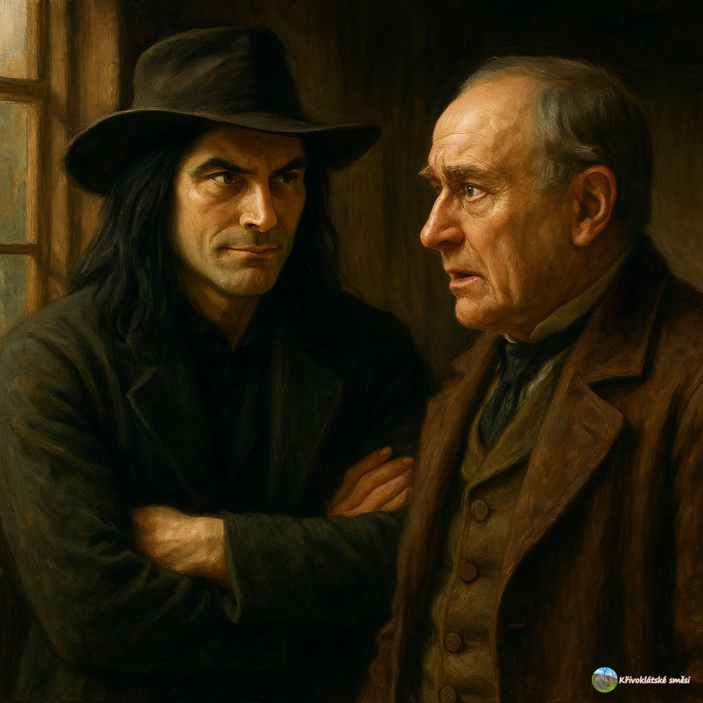 Uvnitř seděl už poměrně starý muž, jenž hleděl z okna ven na své dílo, které už nedokázalo vzdorovat hutím podnikavců a uhlobaronů. Čas šlechty a dřevěného uhlí jako by byl ten tam. Proto se jeho zrak rozzářil, když uviděl vstoupit vzácného pána s kloboukem na hlavě. Kloboukem, který halil dlouhé černé vlasy a skrýval lišácký, zelenavý záblesk v očích. Horní rada se postavil a mávnutím ruky úředníkovi poručil, aby se ztratil. Ten tak bez váhání učinil. Když se dveře zabouchly, onen tajemný muž zkřížil ruce na prsou. Horní rada se uklonil. „Antonín Mayer, knížecí horní rada,“ představil se. Tajemný muž nic neříkal, jen se stále usmíval. Nastalo ticho. „Pán je zdaleka?“ zeptal se rada. „Ani ne,“ odvětil muž. Na jeho slova jako by venku zadul vichr. Horní rada se začal potit. „Příbuzný našeho knížete, pána z Fürstenberka?“ Muž se nahlas zasmál, ale potom opět zvážněl. „Stálo ti to za to, Mayere?“ řekl drze. Horní rada zůstal zaraženě stát, i když byl na různé výstřelky šlechty zvyklý. „Celý život věnovat něčemu,“ navázal muž, „co pak skončí na propadlišti dějin?“ Hutní rada stále nechápal. „Stejně jako šlechta, stejně jako křesťané s jejich orientálním blouzněním, všichni do jednoho nakonec zemřete. Jediné, co se počítá, je, jestli během svého pobytu zde jako plíživý jed otravujete život ostatním lidem a tvorům nebo ne. Uvědom si, Mayere, že nejsi ani víc, ale ani míň než všechno živé kolem!“